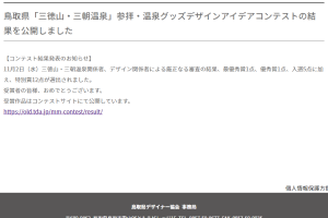 【コンテスト結果発表のお知らせ】11月2日(水)三徳山・三朝温泉関係者、デザイン関係者による厳正なる審査の結果、最優秀賞1点、優秀賞1点、入選5点に加え、特別賞12点が選出されました。受賞者の皆様、おめでとうございます。受賞作品はコンテストサイトにて公開しています。https://old.tda.jp/mm-contest/result/