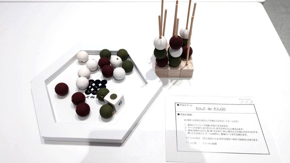 優秀賞1点⽬の『だんごdeだんGO』は、公園だんごを「⽴体三並べ」に⾒⽴て、サイコロの⽬によって、⽩、緑、茶の3⾊の⽟をだんごの串に差し、先に直列に並べた⼈が勝つというゲームで、実際に遊んでみるとなかなか奥が深く、結構熱中してしまう魅⼒を持った作品でした。また、デザイン性にも優れた点が評価されていて商品化の期待できる作品でもありました。