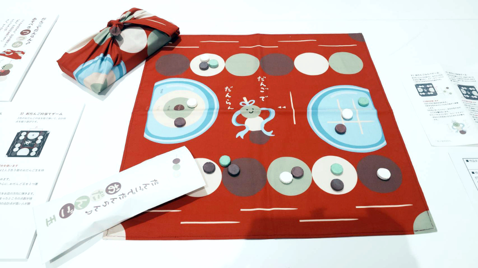 優秀賞2点⽬の『だんごでだんらん♫ あそべる つつみ』は、いわゆるボードゲームなのですが、ゲームのパッケージが⾵呂敷でありゲーム盤である点も含めそのデザイン性の秀逸さに加え、オリジナルのゲーム世界の構築に素晴らしものがあり、これもまたゲームをとおしたデザインの可能性を広げてくれた作品でした。