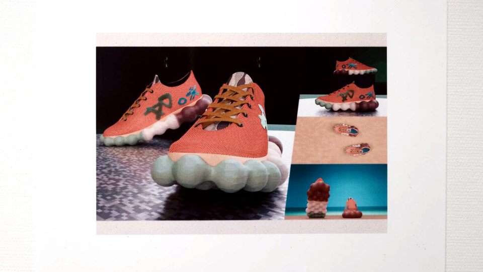 優秀賞3点⽬の『⾜元から魅了する打吹公園だんご』は、なんと!公園だんごをスニーカーにしてしまうという型破りな着眼点が、審査員だけでなく会場を訪れた多くの⼈から「考えもつかなかった」という感想が聞かれるほど「アバンギャルド」なデザインを創出している⼤胆でクリエイティブな発想が評価された作品でした。